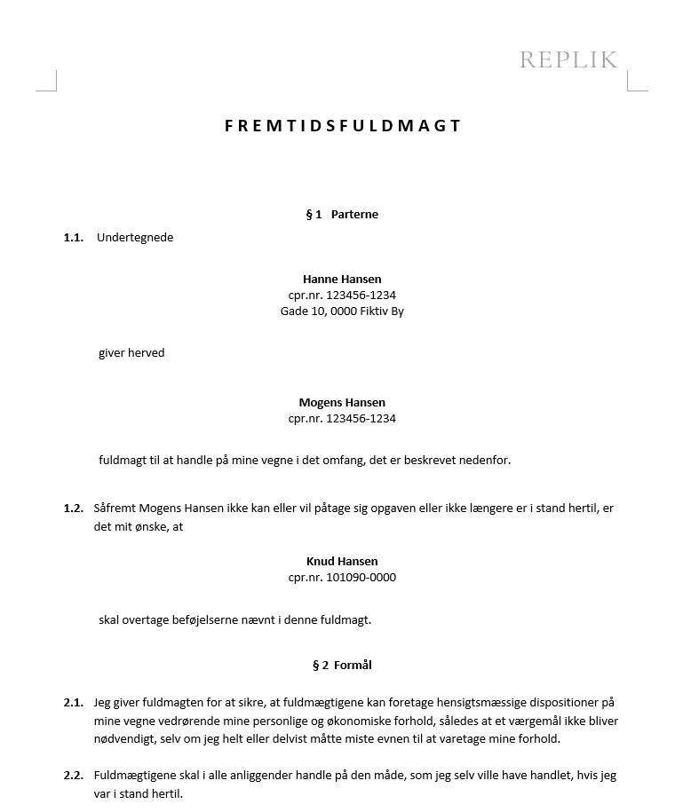 Billedet og pdf’en er tænkte eksempler, men giver et godt indtryk af, hvordan en fremtidsfuldmagt kan opbygges, hvis du selv skal udarbejde eller forstå sådan et dokument.