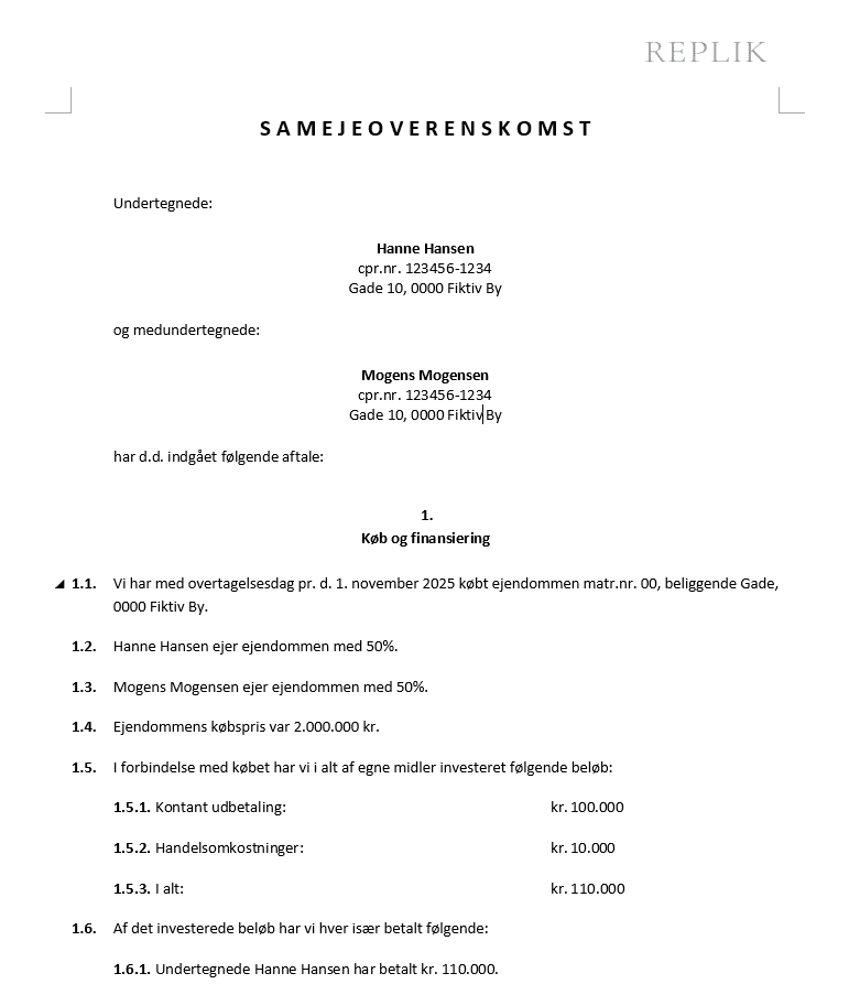 Billedet og pdf’en er tænkte eksempler, men giver et godt indtryk af, hvordan en samejeoverenskomst kan opbygges, hvis du selv skal udarbejde eller forstå en sådan aftale.